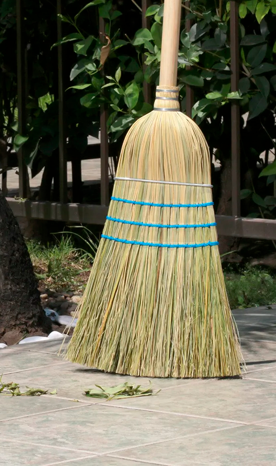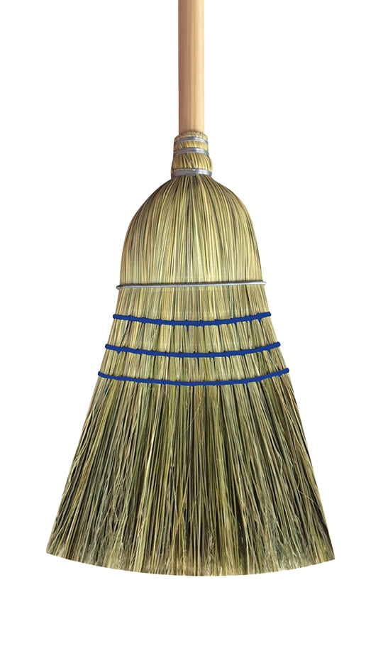 Escoba de espiga para uso rudo en interiores y exteriores. Producto de alta calidad ideal para espacios amplios. Fabricada con materiales naturales y una banda de acero resistente. Mango de madera barnizado de 1 1/8 x 42”.